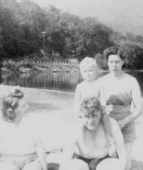 Behind Arlene and the Haskell's in this picture is a small bay and next to the bay is the road that travels along Piseco Lake. On the other side of the road is a hill covered with trees. In those trees was Bucky and Maude's camp. It was always cool there in the summer under the trees. Maude fed the wild raccoons. One spring a raccoon family with many little baby raccoons came to her back porch to get food. The little ones were so adorable and so tiny.